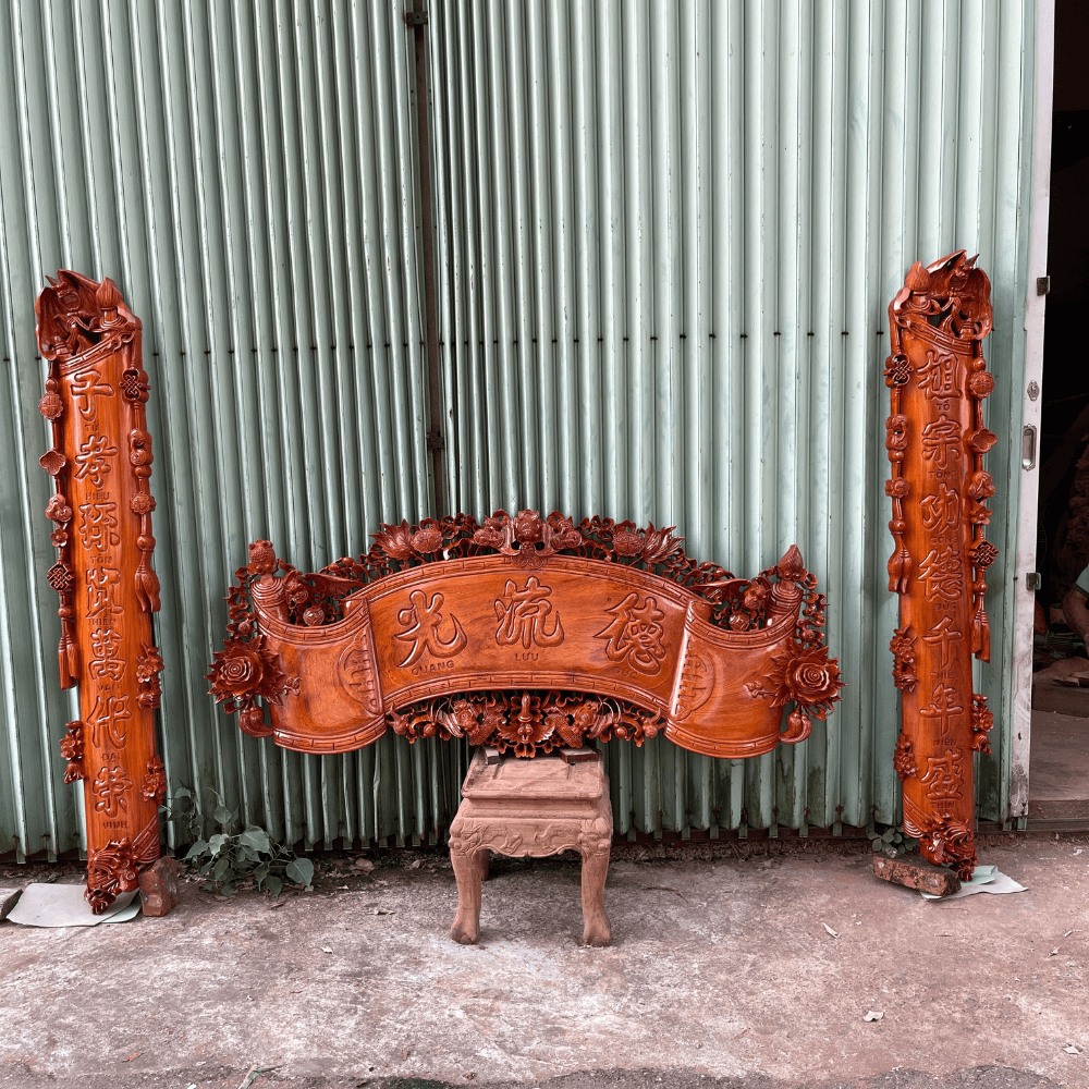 Đồ Thờ Nam Quỳnh rất cẩn thận khi trực tiếp làm tại xưởng, chúng tôi kiểm mộc kỹ càng và cảm thấy vô cùng ưng ý, tâm đắc với mẫu sản phẩm cuốn thư câu đối ngũ phúc 1m76x67 nhỏ nhắn được đục bằng tay siêu đẹp này.